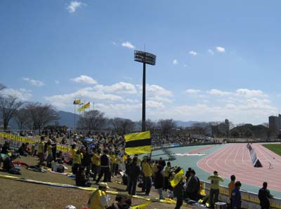 日焼けがひでぇ。顔がヒリヒリしてます。たぐおは敏感肌なの。 朝、目が覚めた時点で9時を回っていた。確か10時集合みたいな事を言われてたような気もしたが、特に慌てる事無く準備をして出発。 10時半過ぎには本城に着いたのですが、駐車場は第一・第二共に満車。う~ん、福岡vs鳥栖の集客力を侮っていたようだ。 所詮はプレシーズンマッチ、地方の市長杯っすよ、なにみんなムキになってんの・・・などとぶつくさ思いながら開放された『鮮ど市場』の駐車場から歩く。 北九州市長杯 二日目 アビスパ福岡 2-1 サガン鳥栖 ええ、僕が着いた時にはもう福岡vs鳥栖の試合が始まってました。どうにも昨日ほどの真剣さが感じられなくてBRIGADEの面々と合流後もあまりマジマジと観ませんでした。外でピザ喰ってたりして。 ただ後半から双方ヒートアップしてリーグ戦でのいわゆる『九州ダービー』の雰囲気がちょっぴり感じられました。 まぁそんなとこです。後は当該チームのサポーターさんのブログとかで確認してつかーさい。 北九州市長杯 二日目 ニューウェーブ北九州 2-0 ファジアーノ岡山 『鮮ど市場』の駐車場から歩いて本陸の駐車場を横切って来たんですが、昨日は見かけなかったコアサポ臭漂うステッカーを貼った岡山ナンバーの車がチラホラリ。昨日はやらなかったが今日は声出し応援やるんかなと思っておったら案の定、本隊が来ちょったようです。 相変わらず我々と同数以上の人数を送り込んで来るなんざ全く小憎らしいヤツラですね。ただ、まぁたかが、と言ってはなんですが市長杯の試合でアレだけの人数が動くなんて凄いなーと。 ズラリと並んだ旗竿の多さにSHIT、いや嫉妬を感じつつも盛り上げどころをよう判っちょるなぁと感心しながらの決勝でした。 福岡と鳥栖の試合が終わってメインからごっそり観客が消えた時は青ざめましたが、試合が始まるとぞろぞろと戻って来てくれたので少しホッとしたりもして。 さて、我輩、試合の分析とかできんし、人が書いた分析も読み飛ばすような男にて試合の展開については他のその手のサイトに丸投げ。 結論から言うと今回参加した4チーム中、北九州が最も仕上がってたかなと。この時期にこれだけ仕上げてきて、更に選手のモチベーションが高いなんて、昨日今日のNWと試合をすればJ1のチームでも苦戦するんやなかろうかと思う程の出来。 試合開始直後から攻勢、よくボールを回し、いつもならヘトヘトになる時間帯でも集中を切らさず、セカンドボールをいつも以上に拾っている。 宮川選手が豪快に二点目を挙げた時点で勝負あった。今日の北九から二点取るのは至難の業じゃ。 この後、両チームともGKを交代したり、次々と選手を交代するなど、完全に練習試合モードになった。ファジアーノ相手に市村選手や森本選手、船津選手を実戦投入出来たというのはプレシーズンマッチとしては上出来。 岡山に揺さぶられるシーンもあったが、キッチリ対応して万全の体勢ではシュートを打たせなかった気がする。結果、無失点に抑え2-0で勝利、ファジアーノ岡山を倒し北九州市長杯連覇を達成、素晴らしい。 キヤマのいない岡山はアムロじゃないガンダムみたいなもんかも知れんが勝ちは勝ちである。 印象に残った選手を少し。 #11 宮川大輔 選手 昨日、岡山の守備力が上がっているようだと書いた僕の面子を叩き潰す2ゴール。この選手がボールを持って前を向いた時はファールで潰す以外止められないんじゃないかっちゅーぐらいの重戦車。ホントこの選手のゴールは破壊的で気持ちええわぁ。 #23 片野寛理 選手 いい。昨日も書いたけどかなりいい。一体何者か。まぁ追々判っていくでしょうが、よくこういう選手を見つけてきたなぁ・・・。 昨日も今日も出場した選手全員が良い働きをしてくれたおかげで誰をピックアップしようかと嬉しい悩み。#13久保田選手も良かった。#16 重光選手も良かった。 この二試合、途中交代・途中出場になっているが冨士選手や佐藤真也選手も相変わらずの勢いを保持。新加入組が良いもんで、去年、酷使したこの2選手を大事に使えそうだ。 この市長杯の出来をシーズン通してやるというのは大変な事で、果たしてそれは可能なんだろうかと不安に思ったりもするわけです。 しかし、今やっている事は間違ってないなという手応えを選手達は感じただろうし、我々もまた今年も楽しませてもらえそうだという手応えを感じられた事が市長杯の最大の成果だったかと思います。 チームとしての課題は今月から始まる練習試合のオンパレードの中で炙り出していけばいい事で、今は只、北九州市長杯を北九州最強のチームが守り通した事を素直に喜び、この二日間、素晴らしい試合を見せてくれたチームに感謝するのみです。 険しい山を登る時には「苦しい苦しい」「あの尾根も越えなきゃならんのか」とウンザリするより、足元に咲く小さな花を愛でるぐらいの余裕が欲しいですな。 今日、僕らはこれから登る険し
