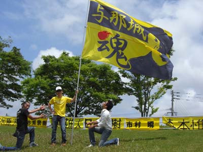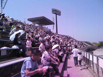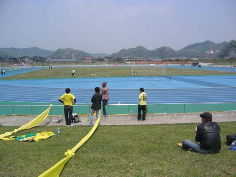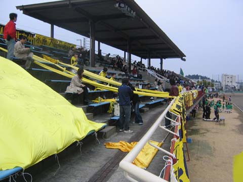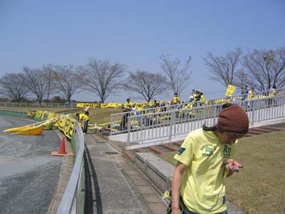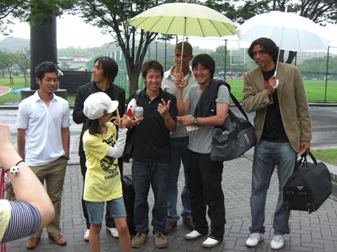 これは個人の負担が大きい上に組織的に守られてしまうとすぐに攻めあぐねてしまう。 岡山戦の2点目以外はドタバタのゴールが多い。チームで守る事もチームで攻める事も出来ているとは言い難い一ヶ月でした。 個人的には富山・湖南・岡山と遠征が続くが、もともと旅好きの僕はさほど苦には感じませんでした。遠征を楽しもうという気持ちがあれば試合に負けても意外に楽しいから困る。 ちなみに僕がBRIGADE本隊に帯同して遠征したのは富山遠征が初めて。負け試合ほど帰りのテンションが高い傾向があり、特に岡山遠征の帰りは異常なハイテンションで死ぬ程笑った。 ホームの試合は鞘ヶ谷での一試合のみ。確か千人を切っていたように思う。人も金も時間もアイディアも、何もかもが足りないながらも始まっちまったもんはしょーがねー、気付いている人達だけで乗り切るしかない。 「まだ始まったばかり」 この頃の僕らの合言葉だった。 画像は北九州サポーターのイメージキャラクターとして長年活躍しておられるFちゃん。来年からは中学生と言う事で出現頻度が下がってしまうらしい。寂しいですね。 冷たい雨の降る岡山でもヒマワリのような眩しい笑顔でした。ちなみに僕を苗字で呼び捨てにします。 『4月』~反撃の狼煙は本城から 6日 ○1-0 アルテ高崎 (本城) 12日 △1-1 FC琉球 (沖縄北谷) 20日 ○1-0 FC刈谷 (本城) 27日 ○2-1 三菱水島FC (笠岡) 本城での観客数は期待以下で去年の3千人はどこへ消えてしまったのかと・・・。それでも結果を出し始めたチームに期待は膨らんでいく。チームとしては調子が良いとは言えないまでも、下位に沈むようなチームではないという手応えを感じた月だった。 何が何でも勝ち点3が欲しかった本城初ゲーム。個人ブログで結果を出すと公言した佐藤選手自身がゴールを決めてJFL初勝利を挙げる。とにかくホッとした勝利だった。 連動した時には驚くべき波状攻撃を見せてくれるが、一つ一つのプレーが単独で発生して単独で完結する個人技頼みのサッカーが目立つ。 ボールを持った選手の選択肢を増やす為にも、ボールを持っていない選手の動きが求められるところ。 個人的にポイントだったのは刈谷戦。JFLでも中位につけ、「運動量が半端ない」という事前情報もあってか、本城不敗記録が止まるとしたらここだろうと内心思っていた試合。 水島戦ではアウェー初勝利を記録。途中出場ばかりでまだノーゴールではあったが、この試合で見せた存在感に『宮川最強FW説』をブチ挙げる。当ブログ最大のファインプレーだったので何度も書いてしまう。 この頃、チームの頑張りが逆に観客動員の少なさを際立たせていた。仲間は確実に増えているんだけども。 『5月』~素晴らしきJFLの旅 3日 △1-1 ガイナーレ鳥取 (本城) 6日 ○3-2 TDK SC (仁賀保) 11日 △1-1 佐川印刷 (本城) 17日 ●1-3 ソニー仙台 (七ヶ浜) 25日 ○4-2 流通経済大 (本城) ゴールデンウィークを挟んでJFLを満喫した5月。僕のデジカメが壊れたり、TOMMY氏のみちのく一人旅や、タチコ嫁降臨、第一回タチコ祭り発生と非常に賑やかでした。 画像は僕のデジカメちゃんが完全に壊れる直前のものなので鳥取戦の時のものと思われます。鉄板の千人です。 「タチコは使い道がない」などと話してた矢先にタチコ嫁がBRIGADE BBSや当ブログに降臨。アクセス解析で「本当にブラジルからのアクセスなんですけど」と団長に相談。ビデオレターとか作ったりしましたね。 ソメザイル氏が「奥さんの為にも頑張れよ」と柄にも無い励ましの言葉をかけるなど懐かしい思い出です。 その後、流通経済大戦で信じられんようなスーパーゴールを決めるなど、まさかのハットトリックでタチコ祭り発生、タチコ嫁の一件を知っていたバックスタンドは大爆笑。サッカーであんなに笑ったのは初めて。 画像はタチコ祭りの後の写真。これに「タチコは街の人気者」的な適当なコメントをつけてタチコ嫁に送ったところ、大層喜んでおられました。少なくとも北九サポーターの中では絶大な人気があるのは事実である。みんな・・・なんだかんだでタチコがいなくなったら寂しいでしょ・・・。 「こういうのが見たかった。娘がとても喜んでいる。私達の誇りです。」的な返信があった事も付け加えておきます。 この頃、メインフラッグとなる「与那城魂フラッグ」登場。僕は天皇杯福岡県予選決勝で少し振らせて頂きました。試合後にインタビューを受けるジョージ監督や佐野選手の後ろでブンブン振ってたのが僕です。光栄でした。 チームとしては、あっさり失点する傾向が顕著になりつつあった時期。繰り返されるあっけない失点癖に怒りの声もチラホラ。 攻撃に重点を置いた結果の失点というより集中力を欠いた隙を突かれての失点はその後も続いていく事になる。 それでも僕らはJFLのど真ん中を自信を持って歩いて行けるようになっていた。 『6月』~JFLの中心で北九州を叫ぶ 1日 ○3-2 ジェフリザーブズ (東総) 8日 ●2-3 栃木SC (本城) 15日 ○2-1 横