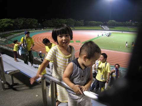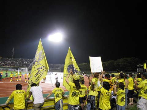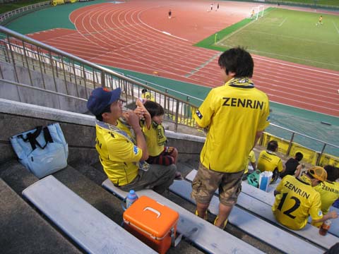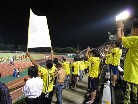 なんつーかこう、仕事でパソコンを使うミッションを課せられるようになってからというもの、プライベートでパソコンを使うのが億劫になって困る。開くのもメンドっちぃぐらいに。 休みの日でもバタバタと走り回ってた吾輩、午後からは入院中のばぁちゃまのトコロに行く。と、ばーちゃんの妹と名乗る女性と鉢合わせになった。向こうは僕を知っていたが僕にとっては初めて会う人だった。曽根に住んでいるという。僕の前の職場が下曽根だったのだが、まさかそんな近場に知らない親戚が住んでいたなんてと驚き。 下関から北九州、行橋・中津・宇佐、そして豊後高田と姫島に至る地域から色んな親戚がばぁちゃんの見舞いに来ている。この地域に僕の親戚がアホほど住んでいる事は知っていたが濃ゆいわ。周防灘の九州側沿岸こそ僕のホームだ。 さて、そんなこんなで今日も今日とて本城まで疾走、いつもより病院に長居してしまったせいで開場後の到着となった。メインスタンドに上がるとバックスタンドにBRIGADEの姿がない。見ると九州リーグ時代のようにメインスタンドのホーム側に陣を敷いていた。実に懐かしい光景である。 久し振りに会う四天王総帥とも「懐かしい」「懐かしい」と語り合う。「今日の客入りは大隈NIFS戦レベル」「いや、ヴォルカ鹿児島戦レベルやなかろうか」などと話していたが、予想外に多かったような気がする。 そんな余計な事を考える余裕さえあった天皇杯福岡県代表決定戦一回戦、ところが蓋を開けて見れば意外にマジになってしまった僕だったのです。 第13回福岡県サッカー選手権大会一回戦 ニューウェーブ北九州 4-1 九州共立大学 JFL前期日程終了時点で4位以内に入っていなかったので、天皇杯本選出場権を得る為に、本大会を一回戦から勝ち抜かなならんワケですが、結果としてそれはそれで良かったなと思う次第です。 というのも、サブメンバー主体で臨んだ今日の試合では明らかに試合勘が鈍っている選手が何人か見受けられた。TRMではない真剣勝負を繰り返して、いろいろと思い出してもらおう。 前半の最初の方は中盤を制圧して切り崩そうという意思が見られたものの、すぐに放り込みっぽいサッカーになってしまった感あり。何せパスの精度が低い上に、前線でキープ出来ないもんだから面として制圧するのが難しい。結局は個人技頼りみたいな。 タチコ選手のヘッドで先制して1-0で折り返したが、評価としては厳しい前半だったのではなかろうか。控え組主体とはいえスキルも経験も、そして体格もNWの方が一回り上のはずなのに、ほぼ互角の印象ってどういうことなの・・・。 後半早々にゴリゴリ押し込まれて同点ゴールを許す。『オイオイオイオイ』というスタンドの空気、試合を観ているスタメン組もさすがに笑えないといった感じでアップしている。 直後に河内選手がPA内で倒されてPKを取る。振り切ればキーパーと1対1という状況もあって相手選手が一発レッド。これでパワーバランスは完全に崩れた。個人的には今日は最後まで11人対11人でやって欲しかったが、まぁ勝負は勝負なのだ。 そのPKを決めて2-1、その後も猛攻を加え10分ほどで2点を追加し、終わってみれば4-1の圧勝だった。とはいえ相手が10人になるまでの内容がイマイチという事もあって今日の試合は評価しづらいが、大会は始まったばかりなので、今JFLでサブに甘んじている選手達はこの大会で名を挙げ、9月のJFLに張り切って登場してもらいたいものだ。 それでも4点目となる佐野選手のFKの見事さや、久し振りに登場した古賀選手の頑張りで、気分よく本陸を後に出来た。 正直、「古賀をひいき目で見ている」と言われても仕方ないとは思うものの、今日の古賀選手は良かったと思いませんか。どうなの。 なんというかこう、「ヒーローになろう」とかいうプレーではなく、「自分に出来る精一杯をやろう」というプレーに好感が持てるというか、相変わらず走らされるキャラクターだが、リーグ戦に出られなくても腐らずによく走ってるなと思うんですわ。 あきらめずにボールを追いかけてチャンスを作り出していたし、惜しいシュートもあったし、信義が決めていればアシストやったんやなかろうか。古賀選手の頑張りに触発されたか、前半に動きの悪かった何人かの選手は後半よくなってた気もする。あくまで主観だけども。 と言いつつ一番印象に残った選手は佐野選手。いつもに比べて力を抜いているようにも見えたがこの働き。あのねじ込むようなフリーキックは今日のハイライトか。ええもん見た。 さて、次は26日(水)18:00からですか。相手は福教大?すんません、わからんす。 平日という事もあって今日ほど観客はおらんでしょうが、僕は行きます。逆にレベスタでの決勝は行けないんですけども、26日に行けない人達の分まで一肌でも二肌でも脱いで盛り上げたいと思います。場合によっては全裸になってもいいっす。いや精神的な意味で。 意外に面白い天皇杯県予選、今