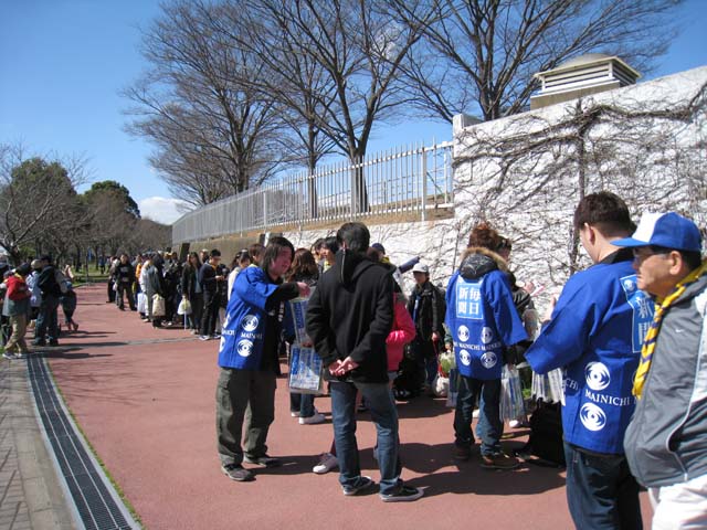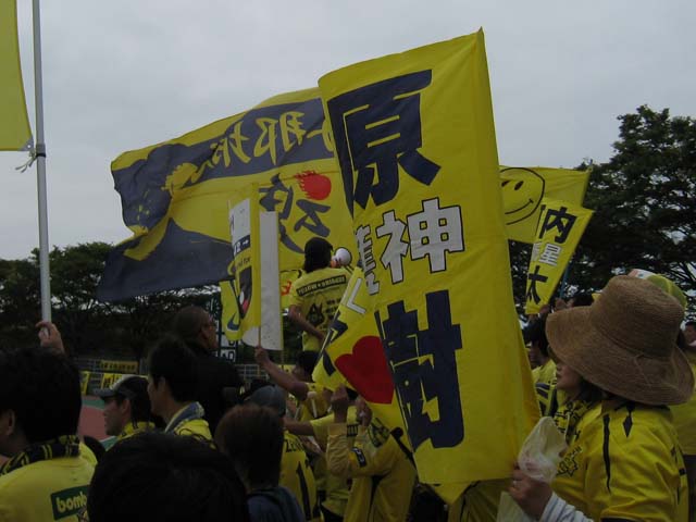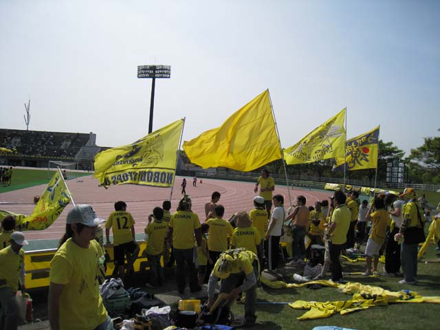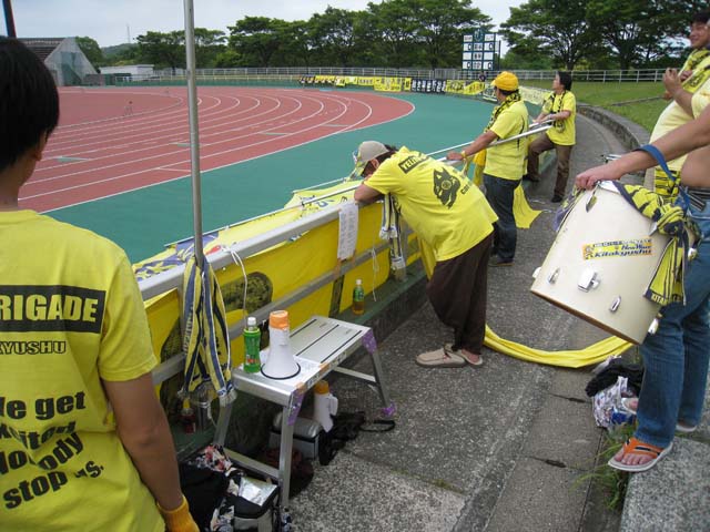 今年は忙しい忙しいとブログでも書き過ぎたと反省し、これからは極力書かないようにしようと思うておるのですが、ああ~忙しいわ~。 今月は最初の一週間に命を懸けてしまった煽りを受け、地獄日程が始まってます。どうも22日ぐらいまでほぼ毎日職場に顔を出しーの、家に仕事持ち帰りーのという状況が続きそうですね。 なにはともあれ頑張ろ。それしか言えんわ。 チャレンジの2008年のシーズンが終わり、勝負に出た2009年を今一度、自分自身、振り返りたいと思う。未公開画像だけでやりたいところでしたが、思いのほか写真が少なくて使い回し多数です。さらに自らの過去記事の引用という掟破りの荒業で仕上げてみました。 『2月』~旅の準備 今年の栄光ある北九州市長杯は例年にない盛り上がりを見せた。この大会の主役であるニューウェーブ北九州以外の参加チームはアビスパ福岡、サガン鳥栖、ファジアーノ岡山とJ2勢。 北九州市長杯 ニューウェーブ北九州 1-0 サガン鳥栖 ニューウェーブ北九州 2-0 ファジアーノ岡山 盛り上がった理由に福岡vs鳥栖の伝統的な九州ダービーが組まれていた事と、二日目に空気を読んだ岡山のサポーターが大挙してやってきた事などがある。ただ、北九州の人達のNWに対する期待も例年以上だったのは言うまでもない。 北九州はいつもの粘り強さが発揮され、大会2連覇を飾る。「シーズン前に仕上がり過ぎではないか」という声は確かにあったが、今思えば少なくともこの大会で見せた堅守はシーズンを通してNWの根幹となってゆく。 地元の大会での2連覇は素直に喜んだが、これでJ確実だと感じた人は一人もいないだろう。本当の戦いはJFL、それは誰もが判っていた。 『3月』~愛と憎しみのJFL、開幕 15日 △0-0 ジェフリザーブズ (本城) 22日 ○2-0 町田ゼルビア (町田) 29日 ●0-1 TDK SC (本城) 画像は開幕戦、開門待ちの行列。驚いたし嬉しかった反面、不自然さや違和感も感じていたが、時間をかけて本当の行列になっていけばそれでいい。『何かの切欠で初めて観に来た』、誰だって最初はそうなのだ。 一万人を集めた開幕戦は残念ながら引き分けに終わったが、続くアウェイで町田に『JFLはそんなに甘くねぇんぞ』と指導してやったのは実に痛快であった。 町田の皆さんも、来シーズンに昇格してきたJFL1年生にガツンと喰らわした時には同じような快感を味わう事だろう。 ただ、その後にTDKに『1万人集めてチョーシこいてる2年生ってぇのはお前か』と言わんばかりに指導を喰らうというのはどうなの。内容的には五分五分だったような気もするが、今年は全くTDKこのやろう、であった。 『4月』~起きているのか眠っているのか 5日 ●1-3 SAGAWA SHIGA (守山) 12日 ○2-1 佐川印刷SC (本城) 19日 ○2-0 ホンダロック (本城) 25日 ●0-1 ソニー仙台 (宮城) 29日 ○2-0 FC刈谷 (本城) この月はとにかく遠征に行った人と行っていない人との間で、チームの印象が微妙にずれていたのを思い出す。遠征から帰ってきた人たちは異口同音に最悪の状態だと嘆いたが、本城での試合しか観てない僕は彼らが言うほど悪いようには見えなくて判断に困った。 しかし3月から5月までの結果をズラッと並べてみると、なるほど、もがいている姿が浮かび上がってくる。去年、負けている相手に勝つ事が出来ないでいる。 ただ、この月、新加入の長谷川太郎選手が本城に登場、目覚しい活躍を見せ、サポーターの士気を高めてくれた。 リーグでは鳥取のスタートダッシュと鳥取を追撃する他チームとの混戦模様が浮かびつつあり、当時、こんな事を書いていた。 4月25日『北九戦線、異状ナシ』より抜粋 『今年のJFLは良くも悪くも団子になっている。「どこのチームにも勝てそうで、どこのチームにも負けそうな」、恐らく多くのチームのサポーターがそうした予感を感じているのではなかろうか。 選手だけではなく応援する側のメンタルも問われるタイトなシーズンである。豹変したアルテ兄さんのお礼参りにビビッている暇などないのだ。』 アルテのお礼参りに言及している・・・。 『5月』~連続する決戦 3日 ●0-1 横河武蔵野 (武蔵野) 10日 ○4-0 流通経済大 (本城) 17日 △0-0 ガイナーレ鳥取 (鳥取) 24日 △0-0 Honda FC (本城) 31日 △2-2 MIOびわこ草津 (湖南) 調子が上がらない中でも決戦はやってくる。同じくJ準加盟の鳥取との対戦は最初の決戦だった。鳥取は当時首位、負ければ勝ち点差は10に広がり、勝てば4差まで縮める事が出来る。 はっきり言って鳥取側は北九州をライバルとは思っていないだろう。全くそんな空気を感じない。今でさえ、だ。だからこそ、ここで鳥取をぶっ叩いておきたかった。 勝てば一気に士気が上がる。僕自身もだ。多くの人達が鳥取戦を負けられない試合と感じ、鳥取まで駆け付けた。見送る側と見送られる側の、あの何とも言えないシンパシーは決戦前の特有の空気だ。 今年は概ね託す側に回ったが、託された人達はいつだって応えてくれたと思っている。 難敵が続き、引き分けで勝ち点を拾っ