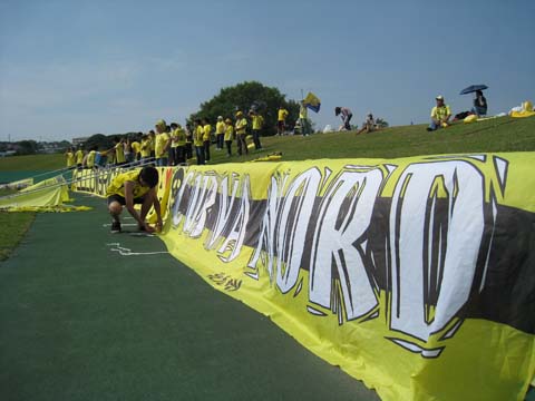 天皇杯も無事に終わり、後はもうJFLを駆け抜けるのみとなった2009年ニューウェーブ北九州、今まさに一つのクライマックスを迎えんとす。 現在、北九州各地で遠征隊の編成が成されている模様。バスからワゴン、軽に至る車両10数台以上が投入される見通しで、さらには長崎縁者の協力を受けた潜入偵察隊や単騎突入の機動歩兵を含めると、先の『東国原の戦い』における宮崎遠征を遥かに上回る大規模な侵攻作戦が予想されている。 ワタクシは僭越ながらBRIGADE02小隊(小倉隊)に配属され、見敵必殺のタオルマフラーを手に身が引き締まる思いであります。 長崎の武装ゲリラどもを蹴散らし、必ずやコミネ師・タカタ師を捕縛せしめ、長崎県が隠し持っている大量破壊兵器を見つけ出して、JFLにおける九州の平和と秩序の守護者が北九州である事を全国に証明して見せる所存であります。 まぁ冗談はさておき、別にこの試合で勝ったからといってJ参入が決まるワケでもないし、例え、仮に、万が一にも負けたとしても、何一つ諦める必要もない試合なんだけれども、勝てば何か大切なモノを得られ、負ければ何か大切なモノを失う予感に満ち溢れてならない。 佳境を迎え混戦を極めるJFLを抜け出す第一歩はもう既に踏み出している。最終コーナーを軽やかにターンし、ゴールまでストレート一直線に飛び込んでいくコースがあるのなら、このV・ファーレン長崎戦はまさに最終コーナーと言っていい。 J参入が決まるクライマックスはまだ少し先だろうが、それでも長崎戦は間違いなく一つのクライマックスになるだろう。 話はちょっと変わって、JリーグやACLを観ていました。サポーターの多さにウラヤマシイと思ったり、『完成された舞台に飛び乗る方が楽だったろうなぁ』とやっかんでみたり。それを拒絶して黎明期のチームを応援する事になったのは、運命であり、決断したのは自分なのだと笑ってみたり。 今の状態でJリーグへ行ったとして、果たして大丈夫なんだろうか、何かこう足りないモノだらけなんじゃないかと不安に思う事はあるんだけれども、やっと2千を越えるようになった観客と、相変わらずのファッキンサポーターズの仲間達と出来る限りの事をやろうと思ってもみたり。 27日の佐世保に集まる北九州サポーターとは、まさに黎明期を支える人達なのだろう。 少数派としての苦しさや不安、それを上回る喜びと楽しさがそこにありますように。 NW北九州としては残りリーグ8試合。しかしチームの歴史はずっと続いてゆく。 僕らは『黎明期を支えた連中』として、間違いなく歴史に残る。派手にやろう。残り全勝の勢いで。 まずは長崎。 過去に生きるか死ぬかの名勝負を繰り広げてきた因縁深い相手である。 死闘確実、観なきゃ損するレベルである。迷っている人がいるなら、皿倉山のケーブルカーから飛び降りる気でこの大侵攻作戦に参加して頂きたい。アウェーでモッシュ祭りをやらかすぜ。 |